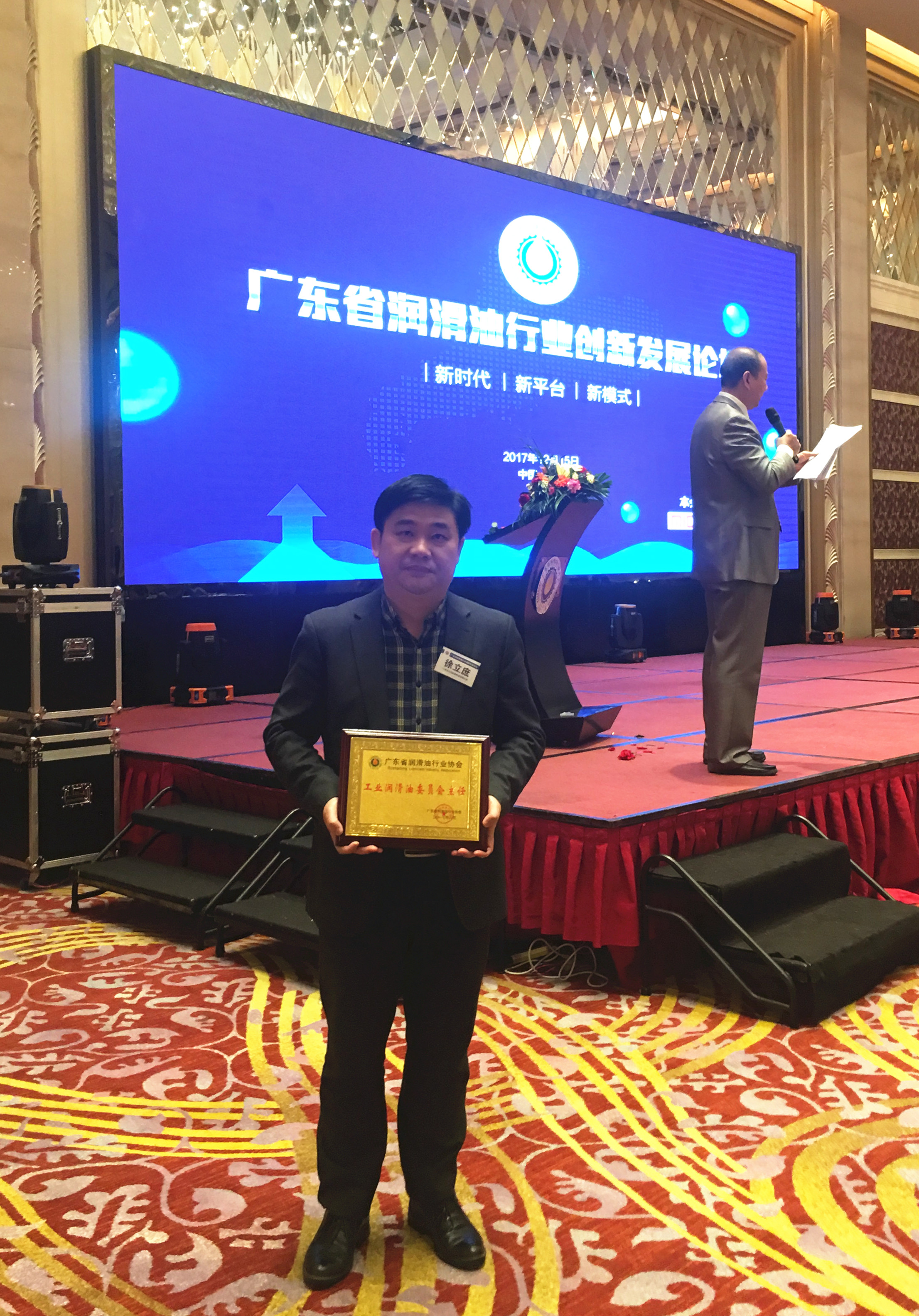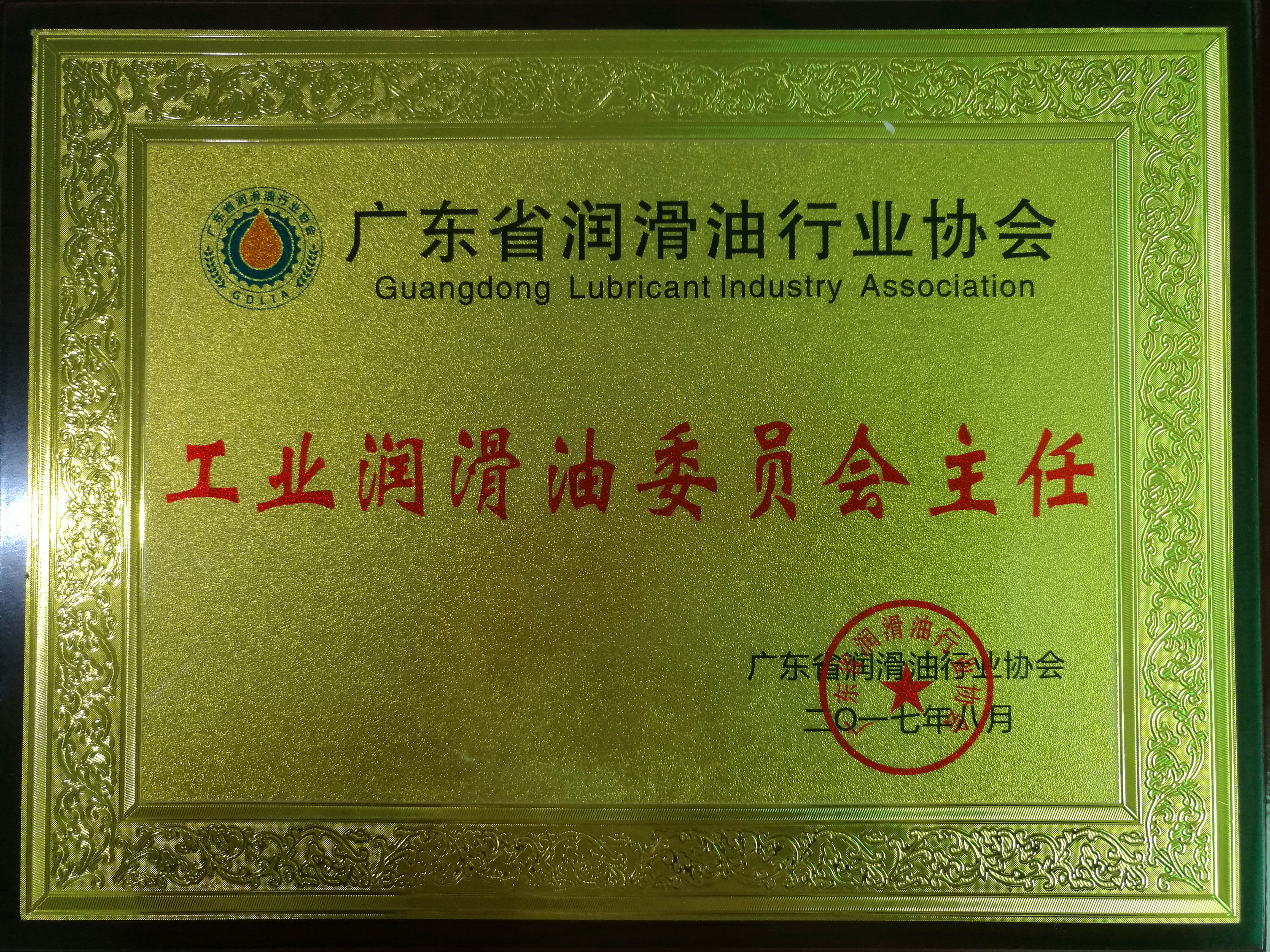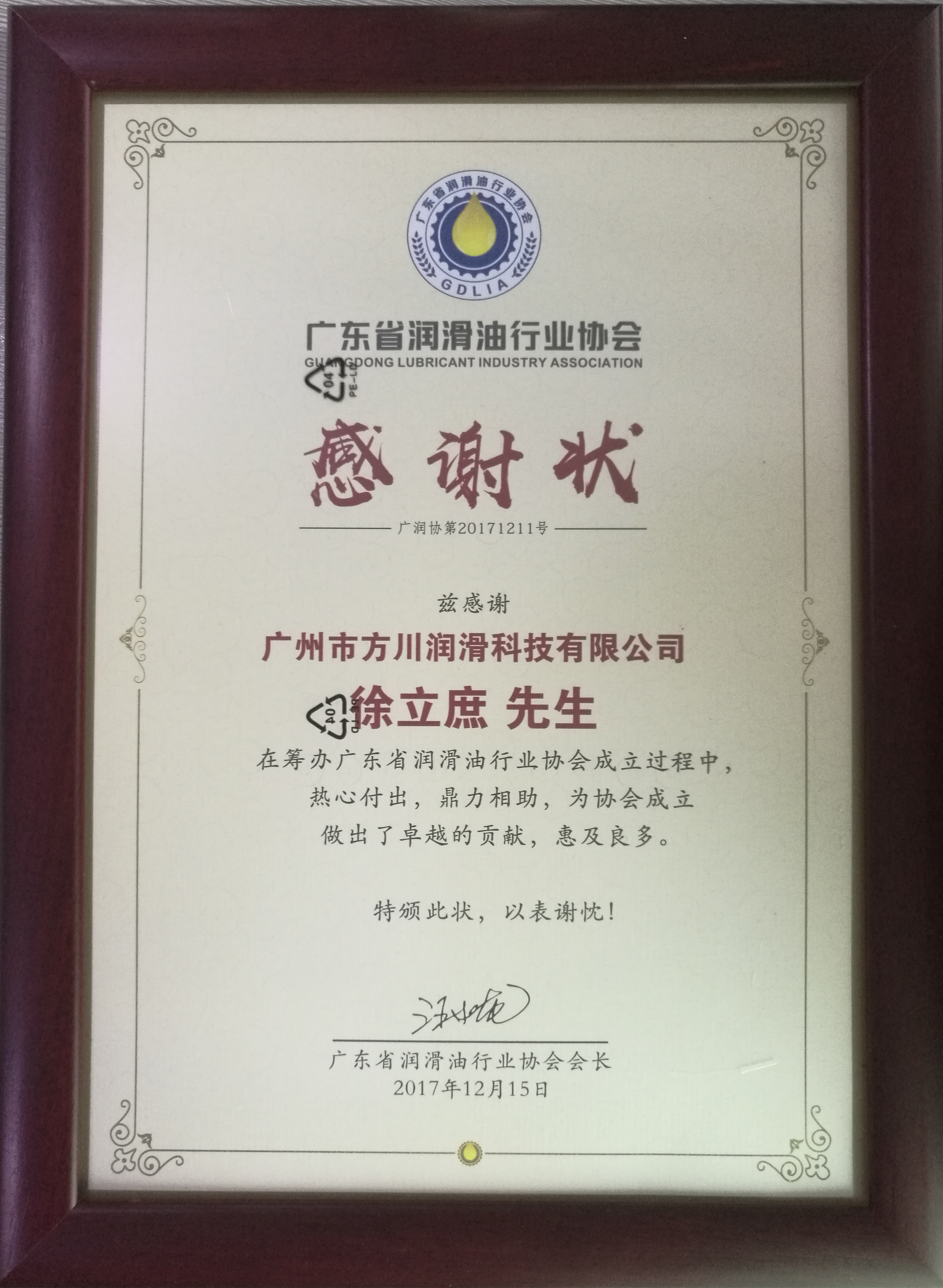 協(xié)會(huì)給我們公司總經(jīng)理徐立庶授匾“廣東省潤(rùn)滑行業(yè)協(xié)會(huì)工業(yè)潤(rùn)滑油委員會(huì)主任”,并頒發(fā)“感謝狀”感謝我們?cè)趨f(xié)會(huì)成立過(guò)程中所作的貢獻(xiàn)。