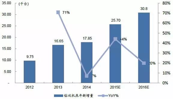手機(jī)銷量的增長(zhǎng)以及金屬化率的提升將繼續(xù)推動(dòng)鉆攻機(jī)床銷售的快速增長(zhǎng),預(yù)計(jì)2016年將新增鉆攻機(jī)床銷售30,800臺(tái),市場(chǎng)規(guī)模預(yù)計(jì)77億元。
