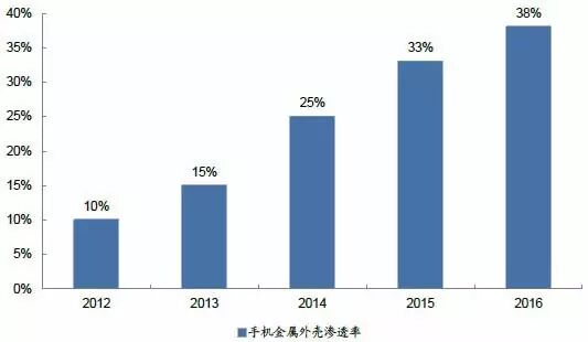 2012-2016年手機(jī)金屬機(jī)殼滲透率變化